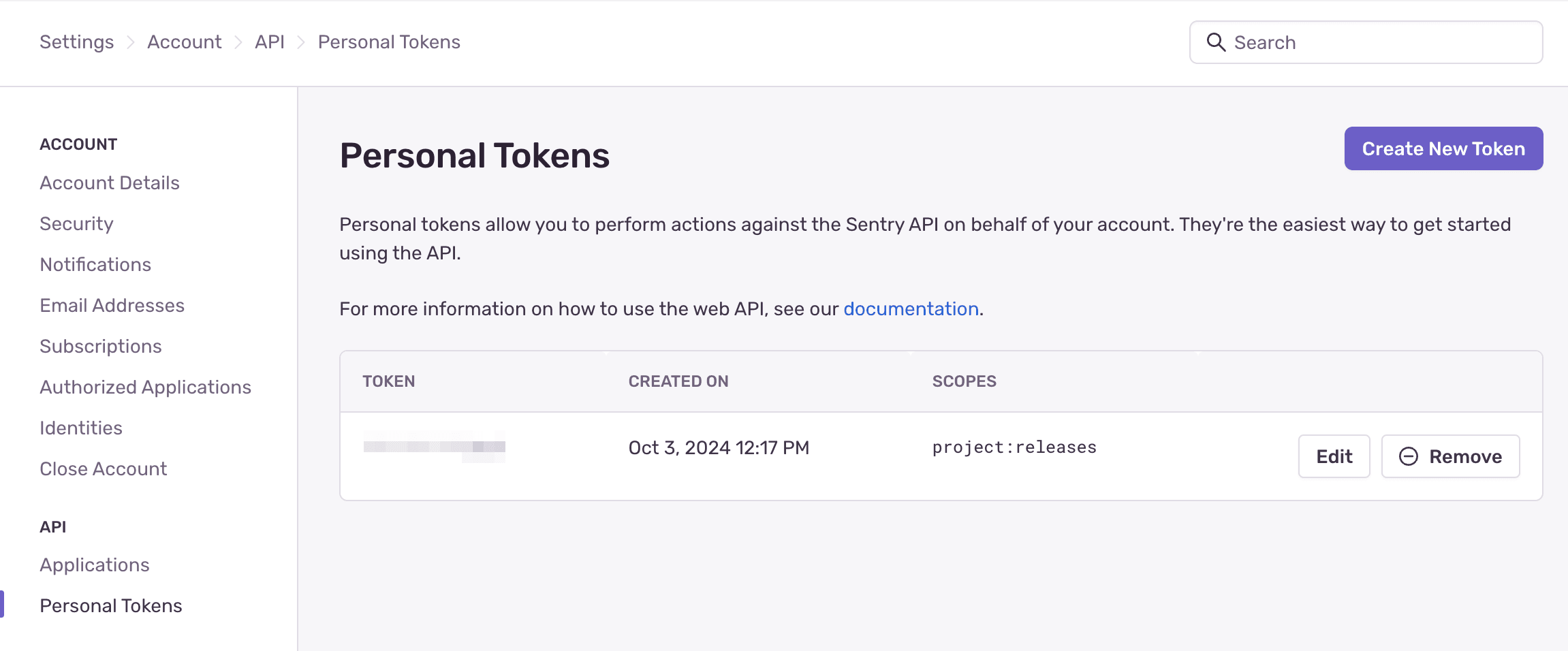 Personal Tokens should be used to interact with the Sentry API on behalf of a user. For example, to fetch all issues for a user, you would use a personal token. We don't recommend using personal tokens for CI tasks because if the user who created the token is removed from the Organization, the token will stop working.